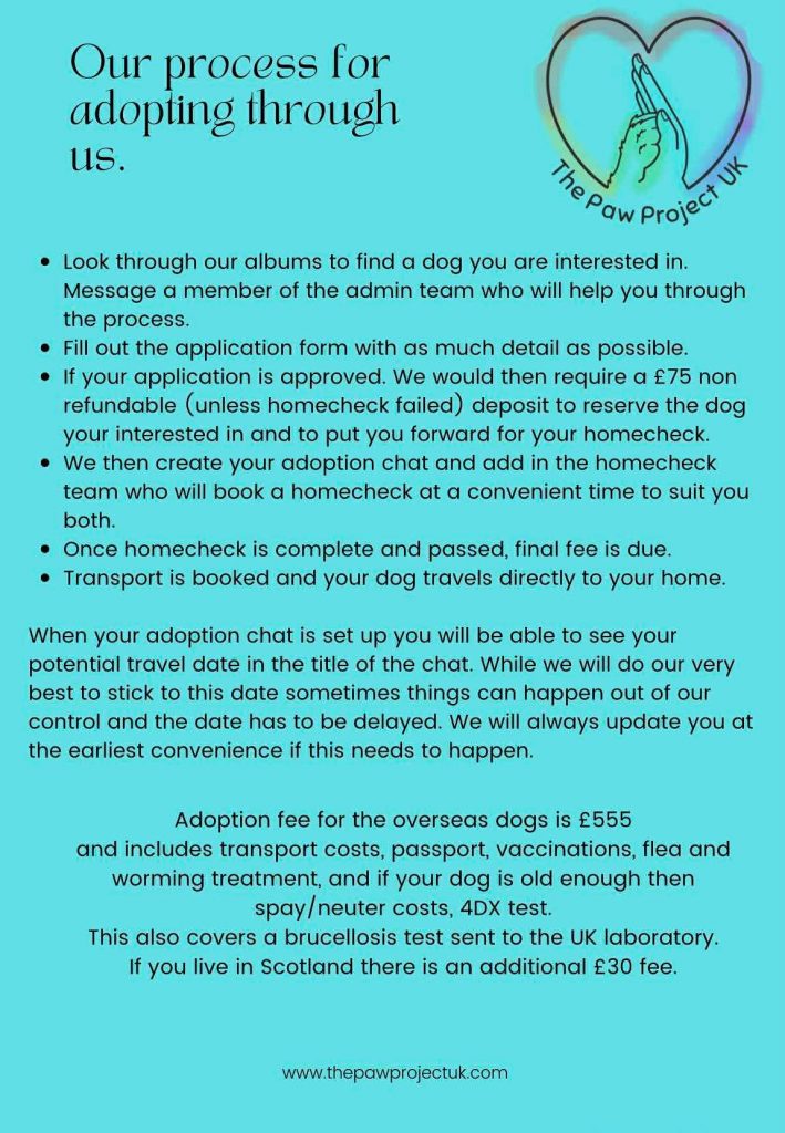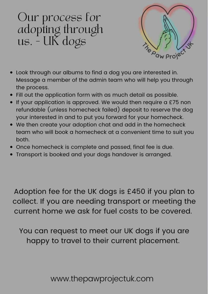 Now that you have read through our adoption process please click below to head over to the ‘Our dogs‘ section of the website to see if you can find the dog you are looking for.
